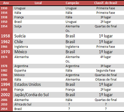 Veja no quadro abaixo um pouco mais da participação do Brasil nas Copas.