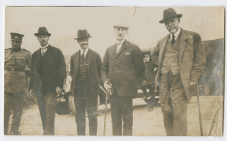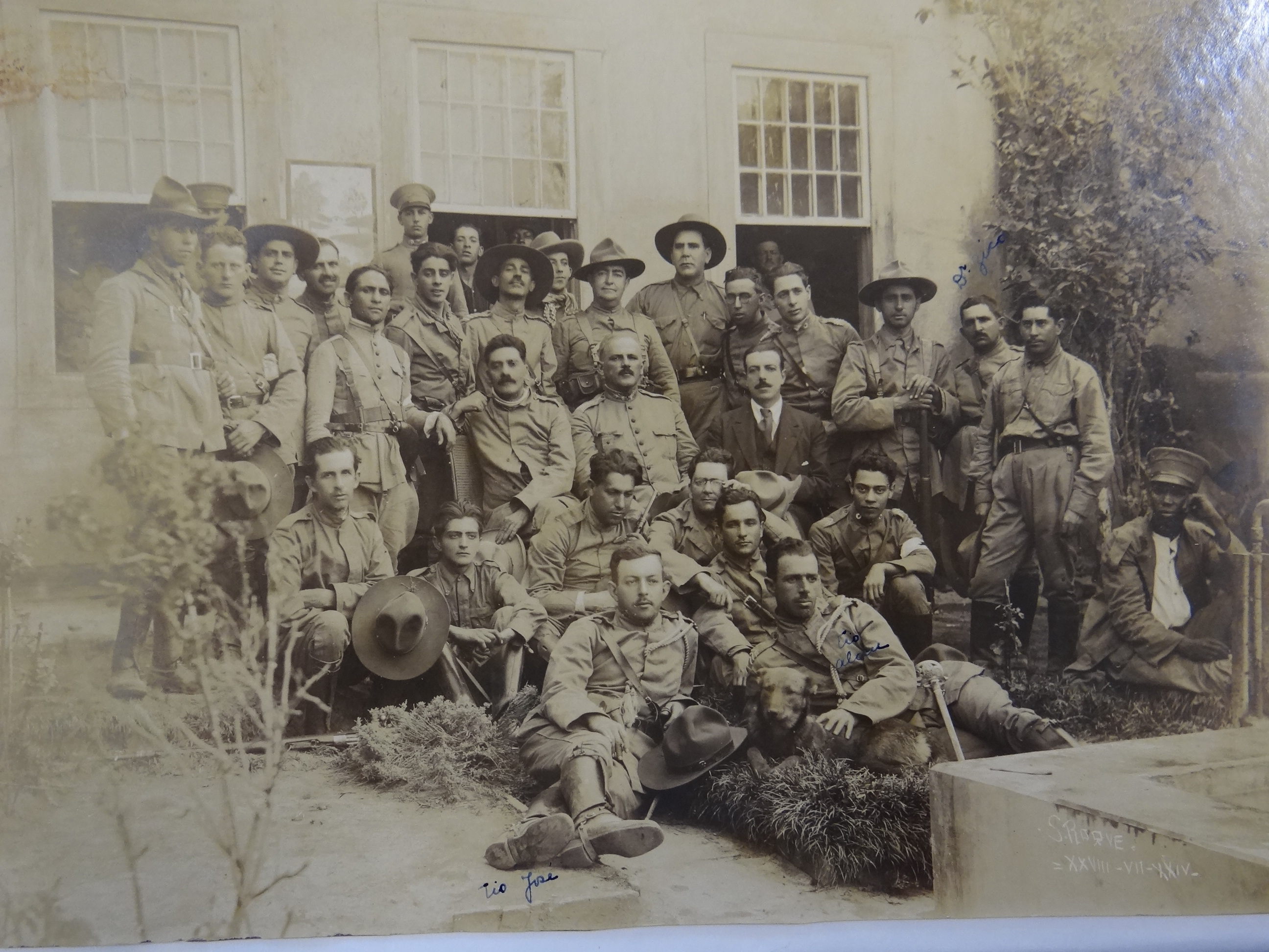 Fotografia das forças governistas na Revolução de 1924. Sentados: deputado Ataliba Leonel, Cel. Franco Ferreira e Júlio Prestes. No 1º plano, os irmãos de Júlio, Alceu e José Prestes. São Roque, 1924. APESP