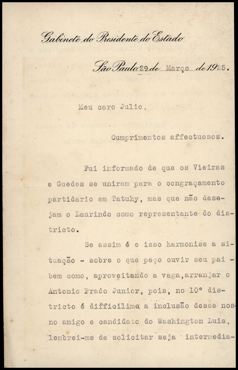 Discurso do deputado federal Júlio Prestes em homenagem ao presidente eleito do Maranhão. 1925. APESP